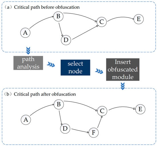 In this paper, we propose an obfuscation scheme targeting critical paths. First, a syntax tree is built by analyzing the XML file, and all critical paths are identified and saved. Subsequently, as shown in Figure 6, when obfuscating one of these critical paths, a specialized module is inserted to extend the path. These special modules can be codec modules, First In, First Out (FIFO) modules, or even internal modules sourced from the project. The existence of these modules is concealed with a complex logic that is challenging to detect, effectively slowing down the critical path and consequently reducing the circuit’s performance.