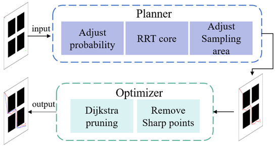 In this section, we discuss the proposed APSD-RRT method, which consists of two modules: the APS-RRT planner and optimizer. Figure 2 shows the overall architecture of the APSD-RRT algorithm. Let the 2D image be the configuration space; it is denoted as Map, where the black and white areas indicate the obstacles and free space, respectively. The initial and target states are marked by red and green points, respectively. The input (Map, xinit, Xgoal) is fed into the planner. The initial path marked with red lines is calculated by the APS-RRT planner (line 2 in Algorithm 2). The optimizer then takes the initial output as its input. It first obtains the key nodes in the initial path using the Dijkstra pruning strategy and then smooths out sharp nodes in the path using the interpolation strategy. Finally, it outputs the improved results, which are marked with dark blue lines. If the initial path does not exist, an error is reported. (line 3–7 in Algorithm 2).