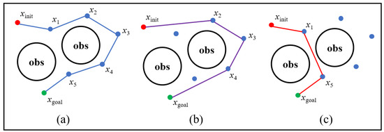 An example of a utilization of the Dijkstra pruning strategy is shown in Figure 4. Let obstacles be denoted by obs. As shown in Figure 4a, the initial path is as follows: xinit–x1–x2–x3–x4–x5–xgoal. As shown in Figure 4b, starting from the initial state, three waypoints xinit, x1, and x2 are chosen in order. Note that the edge {xinit, x2} is free of collisions and the distance is shorter than the original route from xinit to x2. Therefore, the state x1 is considered to be a redundant node and the original route is replaced by the edge {xinit, x2}. Then, consider the relationship between the three waypoints xinit, x2, and x3, where the edge {xinit, x3} is not free of collisions. Therefore, the state xinit is traversed; starting from the next state x2, the same operation is executed until the target state is traversed. Finally, the path is determined to be as follows: xinit–x2–x3–x4–xgoal. As shown in Figure 4c, in the first round, Visit[x1] is set to true, because the distance between x1 and the initial state is the shortest. There is a collision between xinit and x5, where the value of Dis[x5] is infinity. Note that the route from xinit to x5 can be improved by x1 via the relaxation operation; therefore, the predecessor node of x5 is set to x1. Then, taking the corresponding waypoint, the minimum value in Dis, the relaxation operations are repeated until the target state is traversed. Finally, the path is determined to be as follows: xinit–x1–x5–xgoal.