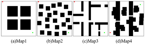 In this section, the results of two simulations, fast planning and path optimization, are presented, along with an analysis. As shown in Figure 6, four types of environments, denoted as Map1, Map2, Map3, and Map4, are utilized to simulate the path planning tasks. The resolutions of the four environments are all 500 × 500. In this planning tasks, area T is set to two-fifths of the entire area, while area M is set to seven-tenths of the entire area. The parameters for the experiments are shown in Table 1. If no path is found within the maximum number of iterations, the experiment is considered to be a failure. Each environment is run 50 times; it should be noted that only the data from the successful planning tests are used for the statistical analysis.