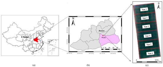Location and orthophoto of the study area: (a) Map of China; (b) Map of Jiaozuo; (c) Orthophoto of the study area.