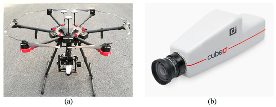 UHD185 integrated hyperspectral equipment: (a) DJI M600 multi-rotor UAV (b) UHD185 Hyperspectral camera.