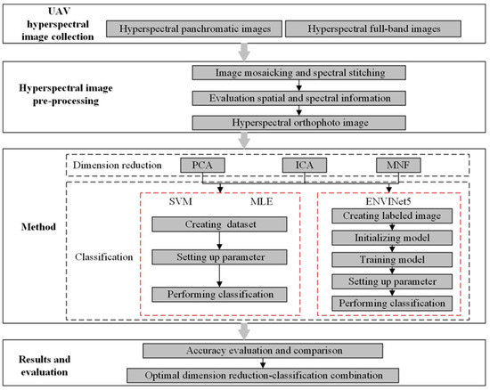 The flowchart in Figure 3 illustrates the data processing methodology in this study, including the hyperspectral imagery collection, data pre-processing, method, and results and evaluation. Detailed methods of hyperspectral imagery dimension reduction and classification are shown in the flowchart.
