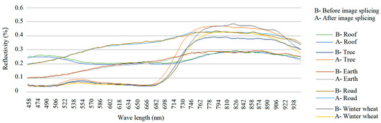 To evaluate the spectral information of the pre-processed imagery, five typical ground objects corresponding to the mosaicked hyperspectral orthographic image and the original hyperspectral image were selected, respectively. Their spectral data information was extracted and then analyzed and evaluated based on qualitative and quantitative methods. Qualitative analysis was carried out by drawing the spectral curve of the extracted spectral data, and the results are shown in Figure 5. It can be seen from Figure 5 that the spectral curves of the selected ground objects of the original hyperspectral images are close to the spectral curves of the hyperspectral orthophoto after spectral curves stitching.