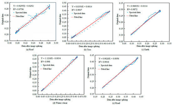 Correlation analysis about spectral curves of typical ground objects before and after imagery mosaicking: (a) Roof; (b) Tree; (c) Earth; (d) Winter wheat; (e) Road.