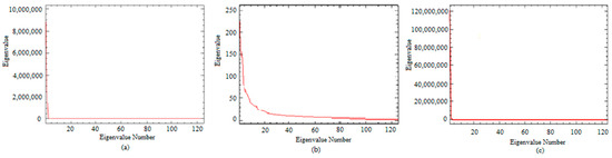 Spectral imagery band eigenvalue transformation results of each dimension reduction method: (a) Transformation results based on PCA; (b) Transformation results based on MNF; (c) Transformation results based on ICA.