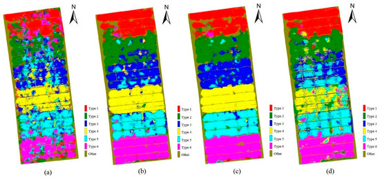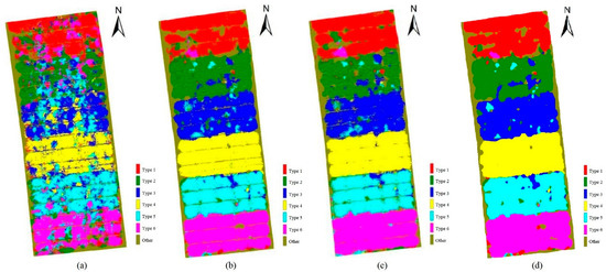 The classification results of MLE can, respectively, be seen in Figure 10a–d. In Figure 10a, it is clear that there is a large number of misclassifications in each winter wheat cultivar, and salt-and-pepper noise is serious. In Figure 10b,c, the MLE classification results show less misclassification and salt-and-pepper noise after PCA and MNF dimensionality reduction. However, some types of winter wheat mix up together, such as type 2 and type 3, and the field bank between wheat cannot be classified. In Figure 10d, on the one hand, compared with PCA-MLE and MNF-MLE, the classification results of ICA-MLE is poor, especially the serious misclassification among type 3, type 4, and type 5. On the other hand, the classification of field banks is better, especially the classification of the longitudinal filed bank is much better than that of PCA and MNF. In summary, for different dimension reduction and classification combinations, MNF-MLE is the best, followed by PCA-MLE, and ICA-MLE is poor. Among them, MNF-MLE and PCA-MLE have few differences in classification results, but their classification results are far superior to ICA-MLE.