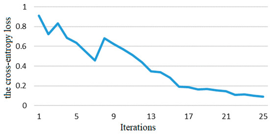 For the optimal parameter training of the ENVINet5 model, the cross-entropy loss value during training was plotted as shown in Figure 12. From the figure, it can be seen that the cross-entropy loss value of the optimal parameter combination model does not show a decreasing trend in the iterative training process; there are some fluctuations, such as an abnormal increase in cross-entropy loss value during the third and fourth iterations. However, with the increase of iterations, the cross-entropy loss value reached a minimum value, which indicates that the model has reached optimal training status.