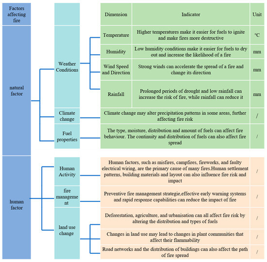 Human factors encompass human activities, fire management, and land-use changes [13,14,15,16]. Human activities, such as accidental fires, campfires, and fireworks, are major causes of many wildfires. Implementing fire management strategies can help mitigate the impact of fires. Furthermore, deforestation, agriculture, and urbanization alter fuel distribution and types, thereby affecting fire risks. Land-use changes can lead to shifts in plant communities, affecting the combustibility of materials. Additionally, the layout of urban road networks and buildings also influences the spread of fires.