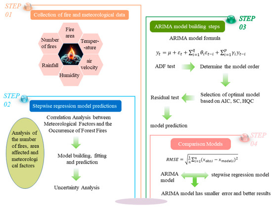 The research framework of this study, as illustrated in Figure 2, begins with the collection of fire incident data and meteorological factors. This is followed by a detailed analysis of the relationship between fire data and meteorological factors, with a focus on the correlation between meteorological factors and the occurrence of forest fires. Upon establishing this correlation, a stepwise regression model is constructed, thoroughly fitted, and predicted. The model is validated through uncertainty analysis to enhance the reliability of the research. The third step involves building an ARIMA model based on fire frequency and affected area data, confirming the model order through ADF testing, selecting the optimal model according to AIC, SC, and HQC criteria, and conducting fire prediction after passing the residual test. Finally, the stepwise regression model and ARIMA model are compared using the RMSE mean square error test, with results indicating the ARIMA model’s superior performance in fire prediction.