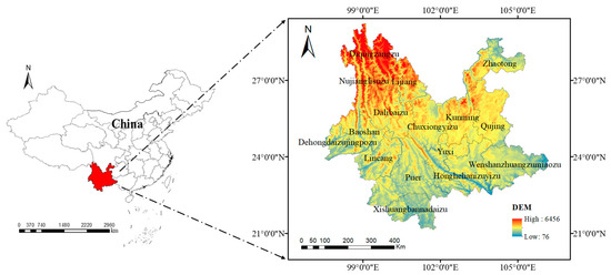 As shown in Figure 3, Yunnan Province, located in the southwest frontier of China, spans from 21°8′32″ N to 29°15′8″ N latitude and from 97°31′39″ E to 106°11′47″ E longitude. The province stretches approximately 865 km east-west and about 990 km north-south, covering an area of around 394,000 square kilometers. This accounts for 4.11% of China’s total area, ranking it eighth among all provinces. Yunnan is characterized by its subtropical highland monsoon climate, distinguished by small annual but large diurnal temperature variations and a clear distinction between the dry and wet seasons. Average temperatures in July range from 20 °C to 23 °C, while in January, they range from 7 °C to 11 °C [39].