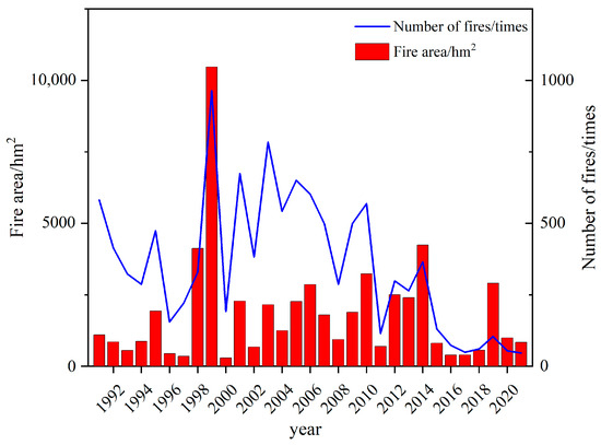 As shown in Figure 4, between 1991 and 2021, Yunnan Province experienced a total of 10,986 forest fires, affecting an area of approximately 57,000 hectares. From 1991 to 1997, the frequency and scale of the fires were relatively stable. However, in 1999, due to extreme drought, insufficient fire prevention awareness, and outdated equipment, the fires were particularly severe. The period from 1998 to 2000 experienced extreme drought conditions, significantly increasing the likelihood of forest fires. Such extreme weather conditions could lead to atypically high peaks in fire occurrences [42]. From 2014 to 2018, the implementation of innovative fire regulations and enhanced monitoring and prevention measures effectively reduced the number and scale of fires in Yunnan Province [43,44].