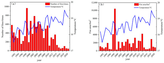 In examining the temporal dynamics of forest fires from 1991 to 2020, Figure 5a,b reveal a positive correlation between the number of fires and the total affected area with annual temperature. Notably, peak occurrences and areas affected by forest fires were particularly pronounced in 1991, 1999, 2001, and 2003, corresponding to periods of rising temperatures. This suggests that increasing temperatures may amplify both the likelihood and extent of forest fires. The upward trend in annual temperatures highlights the potential impact of climate on forest fire behavior, underscoring the importance of incorporating temperature into fire risk assessment models [48,49].