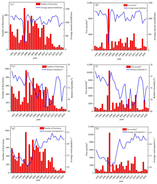Figure 5e displays the variation in the number of annual forest fires in Yunnan Province from 1991 to 2021 under different relative humidity conditions. It was observed that in years such as 1997, 1999, 2004, and 2010, the frequency of forest fires showed a significant negative correlation with lower relative humidity, indicating that reduced humidity levels may lead to more frequent fires. Similarly, Figure 5f reflects that in the aforementioned years, the areas affected by fires expanded with the decrease in relative humidity, highlighting the impact of dry conditions on increasing the scale and intensity of fires. A comprehensive analysis indicates a significant negative correlation between the rate and severity of forest fires in Yunnan Province and relative humidity, especially in years with the most notable number of fires and affected areas. This phenomenon underscores the critical role of relative humidity in forest fire prevention and risk assessment [51]. Therefore, in forest management strategies, meteorological factors like relative humidity should be integrated to optimize fire risk assessment models, enabling the formulation of more precise and effective prevention and control measures.