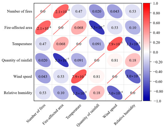 Correlation between number of fires, fire area, and meteorological factors. Note: Red means positive correlation, blue means negative correlation, and “0” means no correlation.