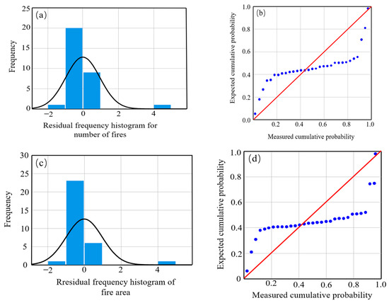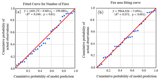 Based on the significant impact of annual average rainfall and average wind speed on the frequency of fires, as well as the particularly notable impact of annual average rainfall on the area affected by fires, a stepwise regression equation model was developed to precisely fit the relationship between these meteorological variables and fire characteristics. As illustrated in Figure 7 and Table 2, Figure 7a displays the fitted curve for the number of fires: (where represents annual relative humidity, where represents annual average rainfall) with an of 0.244 and p = 0.008 < 0.01. Figure 7b presents the fitted curve for the area affected by fires: (with and ). The closer the data points cluster near the diagonal line, the higher the concordance between the model predictions and actual observations. These analytical results quantify the impact of meteorological factors on fire characteristics, thereby enhancing our understanding in this domain.