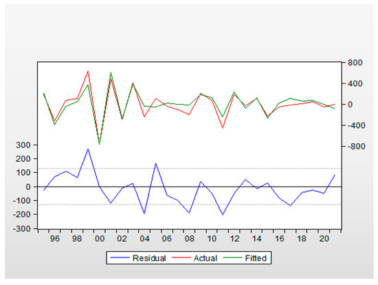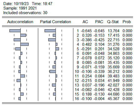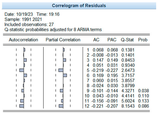 Although the Akaike Information Criterion (AIC), Schwarz Criterion (SC), and Hannan–Quinn Criterion (HQC) are commonly used for model order selection, their minimum values are not the sole criteria for determining the optimal model [58]. In this study, we initially selected the ARIMA model with the lowest AIC, SC, and HQC values and conducted a randomness test on the estimated residuals of this model. If the model passed this test, it was considered optimal. If not, the model with the next lowest AIC, SC, and HQC values was considered, and this iterative process continued until the best model was identified. The residuals of the fitted ARIMA (3,1,5) model were subjected to a white noise test. The autocorrelation and partial autocorrelation plots of the residual series are shown in Figure 10, indicating that the residuals are white noise, which validates the effectiveness of this model. Table 8 presents the estimation results of the ARIMA (3,1,5) model.