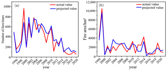 (a) Actual and predicted number of fires; (b) actual and predicted fire area.