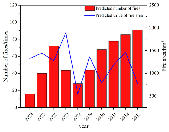 To enhance the accuracy of the forecasts, the static forecasting method for rolling prediction was utilized via the software EViews 8.0 [59], generating predictions for the number of forest fires and affected areas from 2022 to 2033. The results are depicted in Figure 13. The figure reveals that the predicted number of forest fires during 2024–2033 fluctuates significantly, with the years 2026 and 2030–2033 showing relatively higher frequencies of fires. In contrast, the predicted area affected by fires demonstrates an overall trend of increasing and decreasing, particularly from 2028 to 2033, where the rate of increase in the affected area becomes more pronounced.