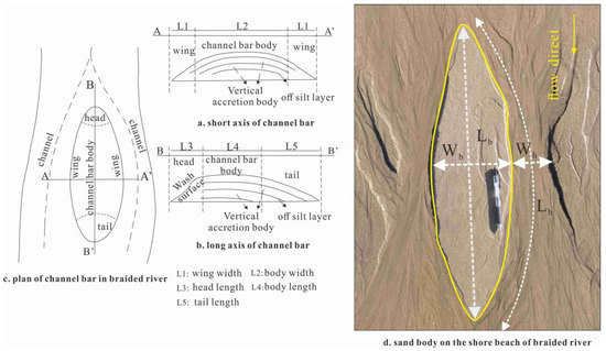 In order to more clearly and quantitatively study the scale of the single channel bar, the single channel bar dam is divided into several parts horizontally, including the head, the main body, the wing, and the tail. The head is the upstream face. Affected by the erosion of the water current, the steep erosion surfaces are likely to develop in the head area (Figure 4a). The end of single channel bar is gentle, while the wings on both sides are tangent to the direction of the current, and they are generally symmetrically developed [35]. This study measured the width and length of the eight selected channel bar sand bodies (Figure 4b–d), and recorded the corresponding data in sheets. In order to better characterize the characteristics of channel bar sand bodies, the length of the channel bar Lb is defined as the longest distance along the long axis of the dam body in the downstream direction, i.e., Lb = L3 + L4 + L5. The width of the single channel bar Wb is defined as the longest distance in the transverse direction of the braided flow; that is, Wb = 2L1 + L2.