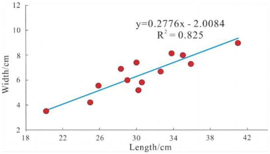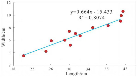 Similarly, for a single braided river sand body, the length of the braided river is defined as Lh, which is the length along the long axis of the channel bar from the top to the bottom. The width of the single braided river sand body is defined as Wh, which is the maximum width between the embankment and the center of the channel bar in the cross-cutting direction of the flowing water. The actual measurement area is bounded by the line when the river bank suddenly becomes steep [36]. According to the length and width of the selected eight single channel bar sand bodies, this study establishes the relevant function relationship. With reference to previous research results, and according to the square value of R (the closer to 1 indicates the better fitting effect), the fitting function method is optimized. Through fitting regression, the length and width of the channel bar, and the length and width of the braided river, demonstrate a good e-index function relationship (Figure 5 and Figure 6), with determination coefficients of above 0.75.
