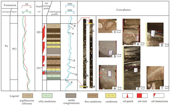 Collective logging diagram of a typical cored well in the PI3 sublayer, (a) parallel to the bedding, silty mudstone of core image; (b) fine sandstone of core image; (c) sandy conglomerate of core image; (d) parallel to the bedding, oil-rich fine sandstone of core image; (e) argillaceous siltstone of core image; (f) oblique bedding, sandstone of core image; (g) oil patch sandstone of core image.