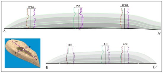 According to Li, Z., et al. [37], the interlayer in the center of channel bar is always approximately horizontal. In the long axis direction, the interlayer facing the water is slightly steeper and the back side is gentler, while the interlayer in the short axis direction is slightly inclined to the two wings of the channel bar. According to the principle of trigonometric function, combined with the comparison diagram of the skeleton profile of single channel bar well tie (Figure 10), it is obtained that in the channel bar in PI3 layer, the inclination angle of the accretion interface in the direction of the long axis is 0.78–1.32°, and the inclination angle of the accretion interface in the direction of the short axis is 2.02–3.78°.