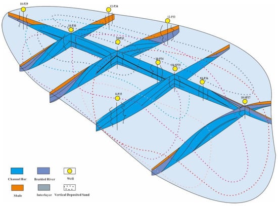 After the determination of the inclination angle of the architecture interface of the accretion, as well as the width and length of the accretion, this study establishes the architecture model of the vertical deposited sand in PI3 sublayer in the dense well pattern area in the Nanwu area [39]. The cross-paleocurrent direction is nearly horizontal, while the paleocurrent direction is slightly inclined to the downstream direction (Figure 11). According to the characteristics of the architecture interface between the proluvial bodies, a single channel bar can be completely divided into four stages of proluvial bodies longitudinally, and each stage of the vertical deposited sand gradually becomes smaller from the bottom to the top, and the change is especially obvious near the top. However, the horizontal change of the thickness of each stage of the vertical deposited sand is not large, indicating that in the formation process of a channel bar, the scale of flood in each period is roughly the same. The silty layer and channel sedimentation can be seen locally in the single accretion, all of which are filled with fine sandstone. The continuity of the silty layer is good, but the sediment is not very thick, only with tens of centimeters of thickness. The sedimentary characteristics of channel sedimentation is similar to that of the braided river; that is, the top is flat, while the bottom is concave. However, the scale of channel sedimentation is relatively small and has poor continuity on the plane. It shows a crosscutting relationship with the silty layer, and has meter-level thickness.