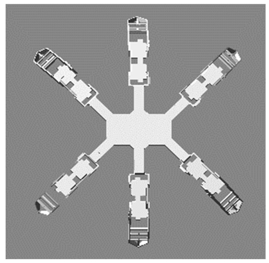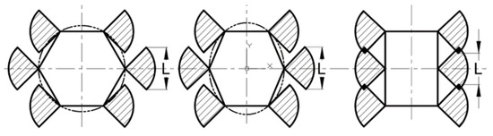 As shown in Figure 1, the overall dimensions of the lunar exploration hexapod robot’s design are 301 mm × 324 mm × 132 mm, with a mass of 10 kg. The structural design prototype of the lunar exploration hexapod robot is a hexapod insect in nature. The leg layout adopts an elliptical layout, which reduces the overall volume of the robot compared with the circular layout. Compared with the rectangular layout, the elliptical layout ensures that the robot legs will not collide while having a large swing space. As shown in Figure 2, the fan represents the range of movement that each leg can move, and L represents the maximum distance that a single leg can walk.