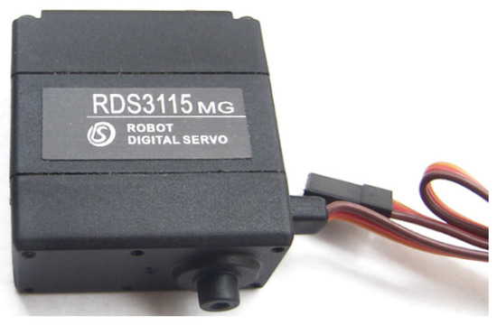 To reduce the overall weight of the robot while ensuring good load capacity, the leg structure of the robot is designed to mimic the joints of insect legs, including the coxa, femur and tibia. Adjacent segments are connected by adjacent joints to enable rotation, as illustrated in Figure 3. The robot’s drive system employs an STM32F407 control board and a 24-channel servo driver board, utilizing serial communication. The control of the 18 drive motors of the robot is achieved by outputting PWM signals. The motors used in this study are RDS3115 dual-axis digital servos, as depicted in Figure 4. The servos internally incorporate a microcontroller (MCU) for control, adjusting the angle through PWM pulse-width modulation with a rotation range of 0–180°. They exhibit the advantages of high control precision and good linearity, with specific parameters detailed in Table 2.