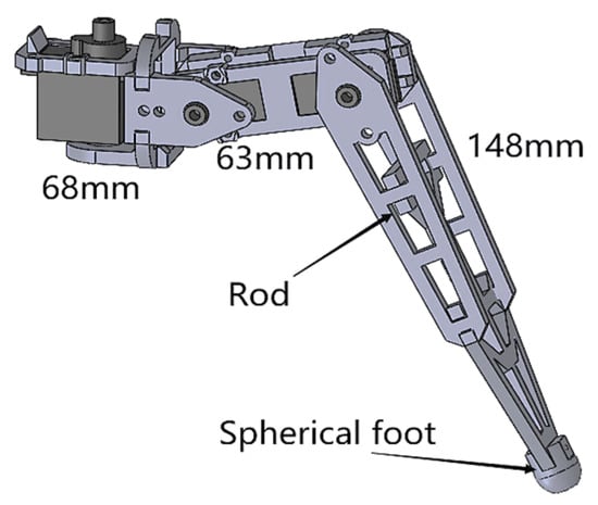 The mechanical leg is an important part of the hexapod robot, and its leg structure needs to be able to ensure that the robot can walk flexibly on the Moon while having a good load-bearing capacity. In this paper, the robot legs are set up as hip, knee and ankle joints according to the leg structure of a hexapod insect; the hip joint provides the power of the robot to move forward, and the knee and ankle joints provide the power of the robot to move up and down. At the same time, the motors at the joints are connected in series with the robot’s leg linkage to ensure that the leg structure of the robot is compact and the rotation angle is larger in the three joints so that the leg can have a larger movement. In view of the strong adsorption of lunar soil, the mechanical leg of the lunar exploration hexapod robot was designed: There are holes on both sides of the mechanical leg fixed to the motors, which are rotated by the motors to drive the legs to move; the legs are fixed between the ankle joints and the foot ends by increasing the connecting rods. At the same time, the connecting rods adopt a skeletonized design so that the robot will shake off the sticky adhesion with its own vibration when it is walking. For the extreme, unstructured terrain of the lunar surface, the design of the robot’s foot end is also essential. George Lordos’ team has conducted a variety of comparative analyses of robotic feet suitable for extreme lunar terrain, including planar, spherical and planar–spherical hybrid designs. Under a 14 kg load, it is found that the planar foot ends will slip due to insufficient contact when in contact with rocks, lunar craters and other environments, while the spherical design has a better contact area and higher stability [24]. Therefore, in this paper, the foot end of the robot is designed as a spherical foot, which can effectively reduce the impact of the complex lunar environment on the robot’s walking. The specific mechanical leg structure is shown in Figure 5 (dimensions of 68 mm, 63 mm and 148 mm).