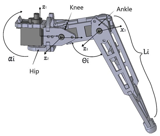 The value of each joint can only be determined by the inverse kinematics solution. That is, the robot may attain the desired posture state by reversing the angle of each joint in its robotic leg so that it can achieve the desired posture state. The inverse kinematics solution of the robotic leg is solved from its forward kinematics model: