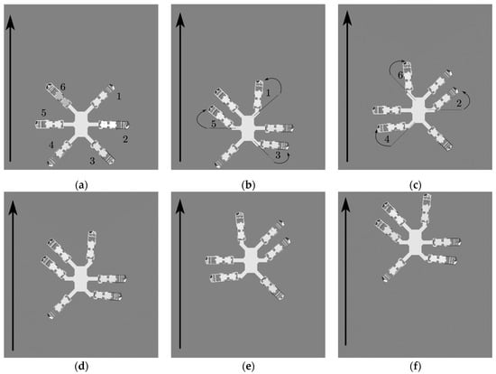 To address the issues of slow robot movement and joint tremors, this paper proposes an “inverted gait” motion mode based on the tripod gait, as shown in Figure 10. At t = 0, all six legs of the robot are supporting the ground, as illustrated in Figure 10a. Subsequently, within 0.5 s, the second group of legs lifts and swings slightly backward, while the first group of legs supports the robot. The robot presents an inverted starting posture, as shown in Figure 10b. Then, within 0.5–1 s, the first group of legs lifts and swings forward, while the second group of legs supports the robot, as shown in Figure 10c. Within 1–2 s, the second group of legs lifts and swings forward significantly, while the first group of legs supports the robot. The reverse swing of the hip joint provides forward propulsion for the robot, as shown in Figure 10d. The alternating movement of the two groups of legs, as demonstrated in Figure 10e,f, completes the robot’s forward motion. Figure 11 depicts the temporal changes in the states of the robot’s six legs in the inverted gait mode. Through comparison, it is found that in the inverted gait mode, due to the small backward swing of the second group of legs during startup, the robot presents an inverted posture, providing a larger swing range for the hip joint movement. This increases the effective step length of the robot during travel, reduces lateral offset and smoothens the subsequent alternating swing of the two sets of mechanical leg joints. This reduction in the time for the two sets of legs to individually swing in place during robot walking accelerates the robot’s movement speed.