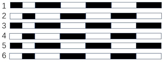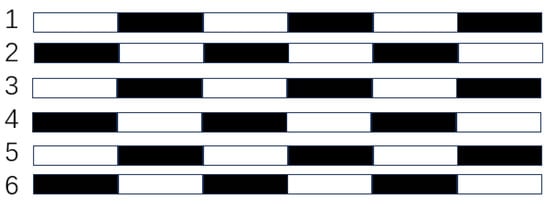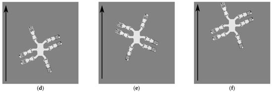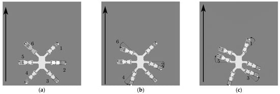 This paper employs the tripod gait for simulating the straight-line motion of the lunar exploration hexapod robot. The traditional tripod gait is illustrated in Figure 8. Firstly, the six legs are numbered and divided into two groups, with legs 1, 3 and 5 forming the first group and legs 2, 4 and 6 forming the second group. The vertical arrows indicate the forward direction of the robot. At t = 0, all six legs support the robot, as shown in Figure 8a. Subsequently, the first group of legs lifts and swings forward within 1 s, while the second group of legs supports the robot, as shown in Figure 8b. After 1 s, the second group of legs lifts and swings forward, while the first group of legs supports the robot, and their hip joints swing backward, as shown in Figure 8c. Figure 8d–f illustrate the alternating movement of the two groups of legs during the robot’s forward motion. The robot’s straight-line motion is completed through the periodic cycle of these two movements. Figure 9 depicts the temporal changes in the states of the robot’s six legs, where white represents the swinging phase and black represents the supporting phase.