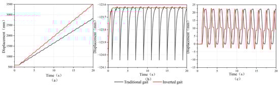 Only adding the drive and contact cannot make the robot walk; it also needs to use the STEP function in ADAMS as the drive function. After adding all the drive functions as required, set the simulation parameters: End Time = 20, Steps = 50. After the simulation, the displacement curves of the robot’s centroid in the X, Y and Z directions are obtained, as shown in Figure 12. The center of the robot coincides with the displacement of its center of mass in the y-axis direction. In the same simulation time, the displacement of the robot along the y-axis direction in the traditional gait is 2235 mm, and in the inverted gait mode, the displacement is 2895 mm. The displacement distance is increased by 29.53%, indicating that the robot moves faster in the inverted gait. Figure 12b shows that the shift of the robot in the x-axis direction is less fluctuating than that of the traditional gait curve during the “inverted gait” movement. Figure 12c shows that the displacement of the robot in the z-axis direction in the inverted gait mode shows periodic up-and-down fluctuations compared with the traditional gait, and the fluctuation amplitude is smaller. According to the comparison of the two gait fuselages and their displacement curves in all directions, it can be found that the movement speed of the robot is increased by 29.53% in the inverted gait mode, the offset fluctuations in the left and right directions and up and down directions are smaller and the robot achieves faster and more stable movement in the same amount of time.