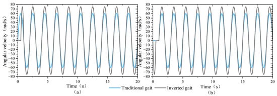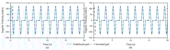Angular velocity curves of the robot’s rotating knee joints: (a) first group of robotic legs; (b) second group of robotic legs.