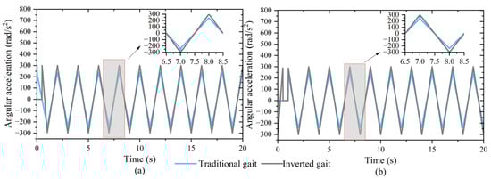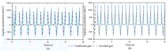 Angular acceleration curves of the robot’s hip joint: (a) first group of robotic legs; (b) second group of robotic legs.