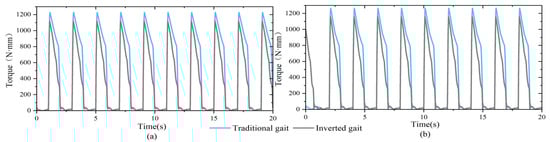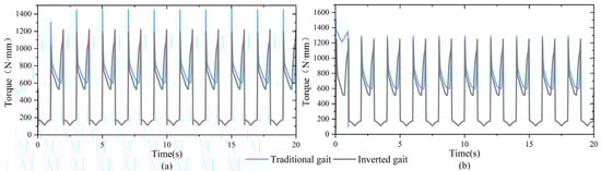 The magnitude of the torque of each joint in the process of linear motion of the hexapod robot is closely related to the bearing capacity of the torque of the motor shaft, which directly affects whether the robot can move normally. Figure 17 and Figure 18 are, respectively, the comparison curves of the robot’s hip and knee torques in the two gaits. Through analysis, it was found that in the traditional gait, the maximum torques of the hip joints of the first and second groups of legs were, respectively, 1228.06N·mm and 1265.28N·mm, and the maximum torques of the knee joints were, respectively, 1445.88 N·mm and 1288.36 N·mm. In the “inverted gait” mode, the maximum torques of the hip joints of the first and second groups of legs were, respectively, 1118.79 N·mm and 1159.45 N·mm, and the maximum torques of the knee joints were, respectively, 1218.56 N·mm and 1248.26 N·mm. Compared with the traditional gait, the maximum torque of the leg hip joint for the first and second groups of the robot in the inverted gait mode is reduced by 8.9% and 8.3%, respectively. The maximum torque of the knee joint is reduced by 15.7% and 3%, respectively. This is because, in the inverted gait mode, the inverted posture of the robot during startup provides greater swing space for the robot’s hip joints. The increased swing amplitude of the joints during subsequent motion results in larger centrifugal forces acting on the corresponding joint parts. This causes certain masses to experience larger centrifugal moments at greater distances, affecting the moment of inertia. Additionally, the variation in joint swing amplitude increases the coupling effect between the robot’s joints, leading to a reduction in torque. This indicates that, in the “inverted gait” mode, the torque borne by the robot’s motor shaft is less than that in the traditional gait mode, enhancing the stability and load-bearing capacity of the robot during motion. At the same time, the torque data are below the limit value of the robot’s motor shaft, demonstrating the rationality of the robot’s structural design and confirming that the robot can successfully fulfill its operational requirements.