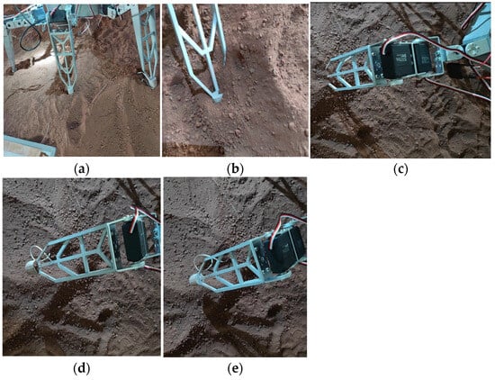 Figure 20 shows the robot’s standing posture in the simulated experiment chamber. In Figure 20a, it can be observed that the spherical design of the robot’s foot end allows it to stand well on the unstructured terrain of simulated lunar soil. Figure 20b depicts the robot’s foot in a small lunar crater, illustrating that the leg design effectively prevents sinking. Figure 20c–e display the robot’s leg positions during lift-off, revealing minor lunar soil adhesion to the robot’s foot after lifting, but the robot’s leg movement effortlessly dislodges the soil particles from the hollow part, with the metal material effectively preventing soil adhesion.