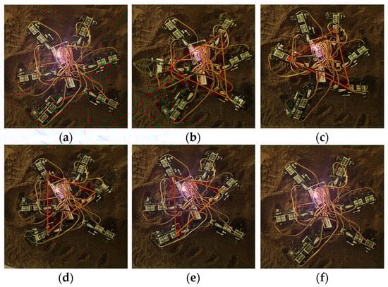 The “inverted gait” diagram of the lunar exploration hexapod robot: (a) initial state of the robot; (b) robot morphology at 0.5 s; (c) robot morphology at 1 s; (d) robot morphology at 2 s; (e) robot morphology at 3 s; (f) robot morphology at 4 s.