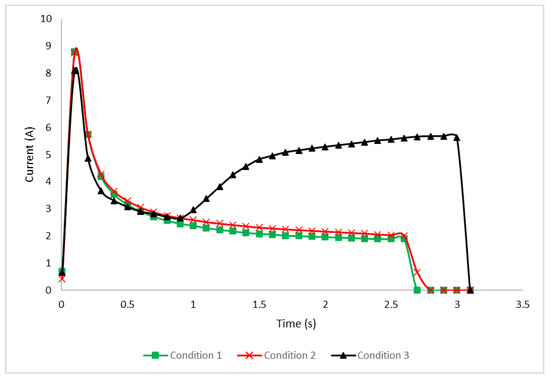 To gain a better understanding of the obtained current data, we compared the three types of current data for conditions 1, 2, and 3 of the RPM equipment using average data, as shown in Figure 7. There was a big difference between the three types of data in terms of data patterns and lengths (data dimension). Therefore, the use of time-series feature extraction is useful for dimensional reduction [30]. Dimensional reduction makes the dataset used as input for ML modeling have the same data dimensions, meaning the same number of variables or features.