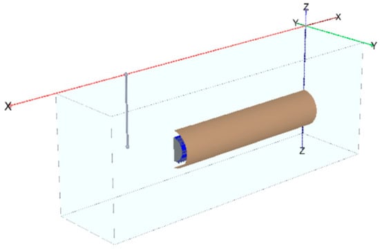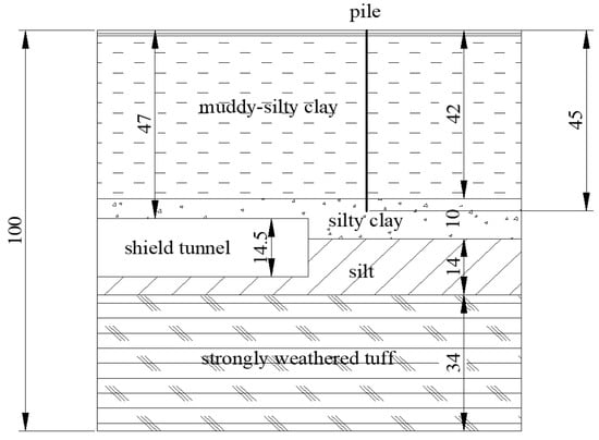 The numerical model of the influence of the shield construction on the displacement of the front pile is established using PLAXIS three-dimensional finite element software (https://www.bentley.com/software/plaxis-3d/). The constitutive model of the soil adopts the simple, fast, and easy-to-converge Mohr–Coulomb elastic–plastic model, which is often used in engineering design. The shield shell is simulated using the plate element. In order to avoid the influence of the boundary conditions of the model, the size of the model should be at least three times larger than the size of the main structure. The model is 200 m long, 100 m wide, and 120 m high. The upper surface of the model is free, the horizontal constraint is applied to the side, and the bottom surface is completely fixed. The rationality verification of this numerical model based on the actual field data is referred to []. The grid sensitivity is checked at the time of the model’s building to ensure that the numerical model is consistent with the actual engineering situation. In this model, the soil element uses a 10-node tetrahedral element, the plate element uses a 6-node triangular element, and the 12-node interface element is used to simulate the interaction between the structure and the soil. The global density of the model is set to medium, and a total of 235,051 units are generated. The specific material parameters are shown in Table 2. The numerical model is shown in Figure 5.