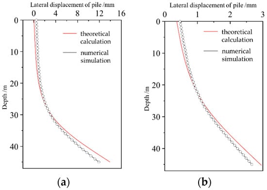 Comparison of calculated and theoretical values of lateral displacement of pile foundations. (a) x = 10 m; (b) x = 20 m.