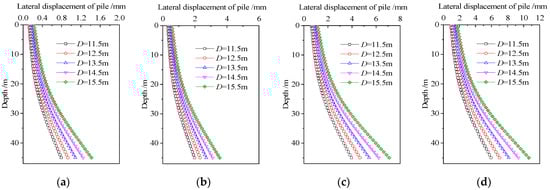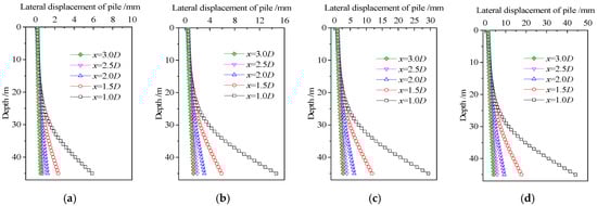 The lateral displacement of the pile foundation under the influence of the shield’s outer diameter. (a) q = 20 kPa, (b) q = 50 kPa, (c) q = 100 kPa, and (d) q = 150 kPa.