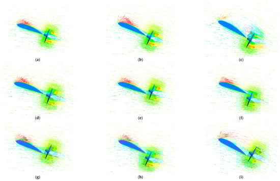 For the horizontal position at , by changing the vertical offset of the propeller, it can be found that there is a significant difference in the inflow of the propeller where the upper inflow is mixed with the outflow of the wing. For the flow field near the trailing edge of the propeller, a deflection was found in the inflow direction of the propeller at with the increasing velocity. It was more obvious for the propeller mounted above the paddle. On the contrary, the interaction with the lower wing was weak. For the two pusher structures at a 30° AoA with a distance of from the trailing edge and a vertical offset of and , the airflow through the wing interacted with the rotor flow field, creating a stabilized leading edge vortex [28]. The vortex at interacted with the inflow of the propeller, and the vortex at began to affect the propeller’s tip vortex and down wash flow, forming another smaller vortex behind the paddle. Therefore, when the trailing edge of the wing approached the tip of the blade, the eddy current action was more intense, and the with a large vertical offset weakened the eddy current intensity above the wing, thereby increasing the lift.