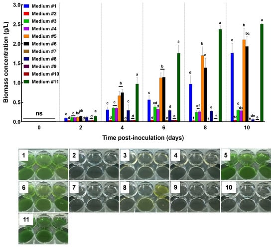 Growth of Leptolyngbya sp. KIOST-1 cultured in 11 different media for 10 days (mean ± standard error, n = 2). The y-axis shows the biomass concentration, and the x-axis shows the days of culture. Significant differences are represented using different lowercase letters. “ns” means “there is no significant difference” as determined by one-way analysis of variance (ANOVA) with post hoc Tukey’s test, where p < 0.05. The black numbers on the image displaying the culturing plates indicate the media number.