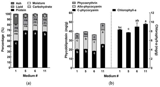 Figure 3a shows that cells cultured in four different types of media contained a protein content of over 67%, with the exception of medium #1. Cells cultured in medium #1 had significantly less protein and a higher ash content compared to the other three media. In lipid and carbohydrate contents among all four media, there were no significant differences. As shown in Figure 3b, the levels of C-phycocyanin, a representative cyanobacteria pigment, in the cells cultured in media #11, #5, #1, and #6 were 25.85 ± 0.19, 20.61 ± 0.03, 20.23 ± 0.63, and 18.47 ± 0.10 mg g−1, respectively. The chlorophyll-a levels in the cells cultured in media #11, #6, #1, and #5, were 9.57 ± 0.16, 8.99 ± 0.81, 8.36 ± 0.05, and 7.73 ± 0.01 mg g−1, respectively.