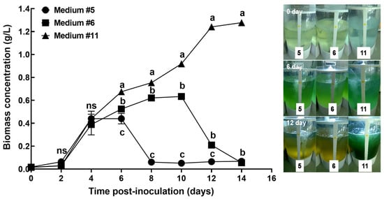 The biomass concentrations for the pilot-scale cultures (200 L scale) are shown in Figure 4. The highest growth was recorded in medium #11, with a biomass concentration of 1.16 ± 0.03 g L−1. Although media #5 and #6 exhibited growth similar to that of medium #11 until day 4, there were significant decreases in biomass concentrations from days 6 and 10, respectively (p < 0.05).