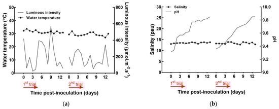 (a) Water temperature (left y-axis) and luminous intensity (right y-axis) and (b) salinity (left y-axis) and pH level (right y-axis) in Leptolyngbya sp. KIOST-1 culture pond during two cultivation trials.