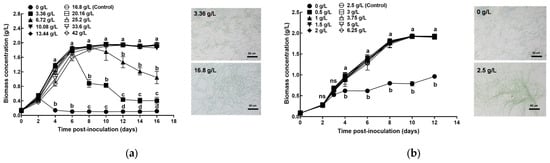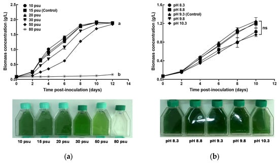 Growth of Leptolyngbya sp. KIOST-1 cultured in (a) six different salinity conditions and (b) five different pH conditions (mean ± standard error, n = 3). The salinity and pH values of the control were 15 psu and pH 9.3, respectively, which are similar to those of the SOT medium. The y-axis shows the biomass concentration, and the x-axis shows the days of culture. Significant differences are represented using different lowercase letters. “ns” means “there is no significant difference” as determined by one-way analysis of variance (ANOVA) with post hoc Tukey’s test, where p < 0.05.